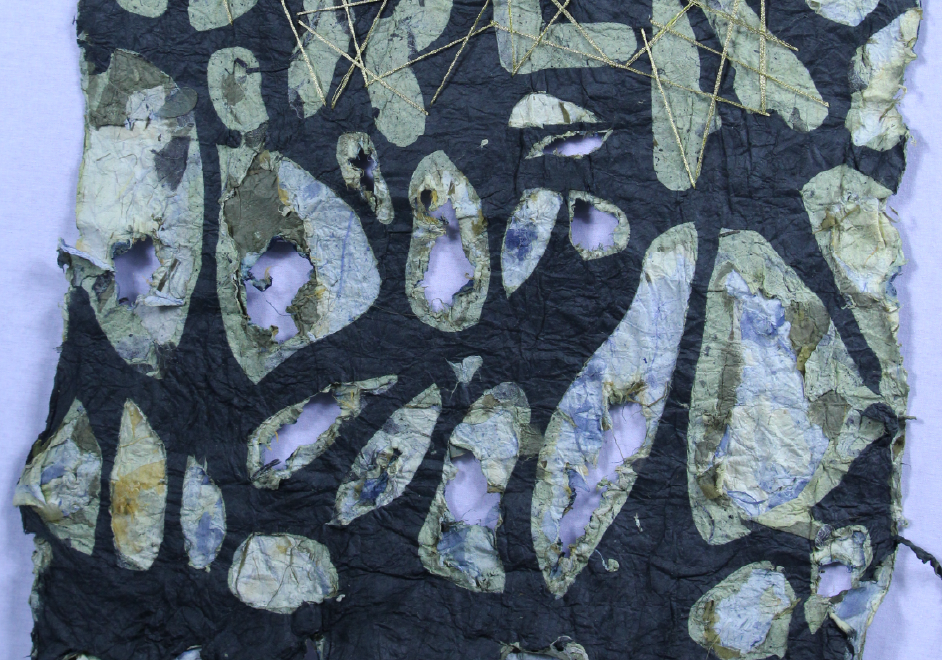 During the fabrication process, I explored a traditional Korean papermaking technique known as joomchi, a 500-year-old method that uses water and manual agitation to felt multiple layers of hanji (mulberry paper) into a single, durable, and highly textured material. Through squeezing, rubbing, tearing, and cutting into the paper, I embraced a sense of physical chaos that mirrored the conceptual themes of the piece. Leaves and plant materials were embedded between layers, revealing organic textures and hidden details as the paper was manipulated.