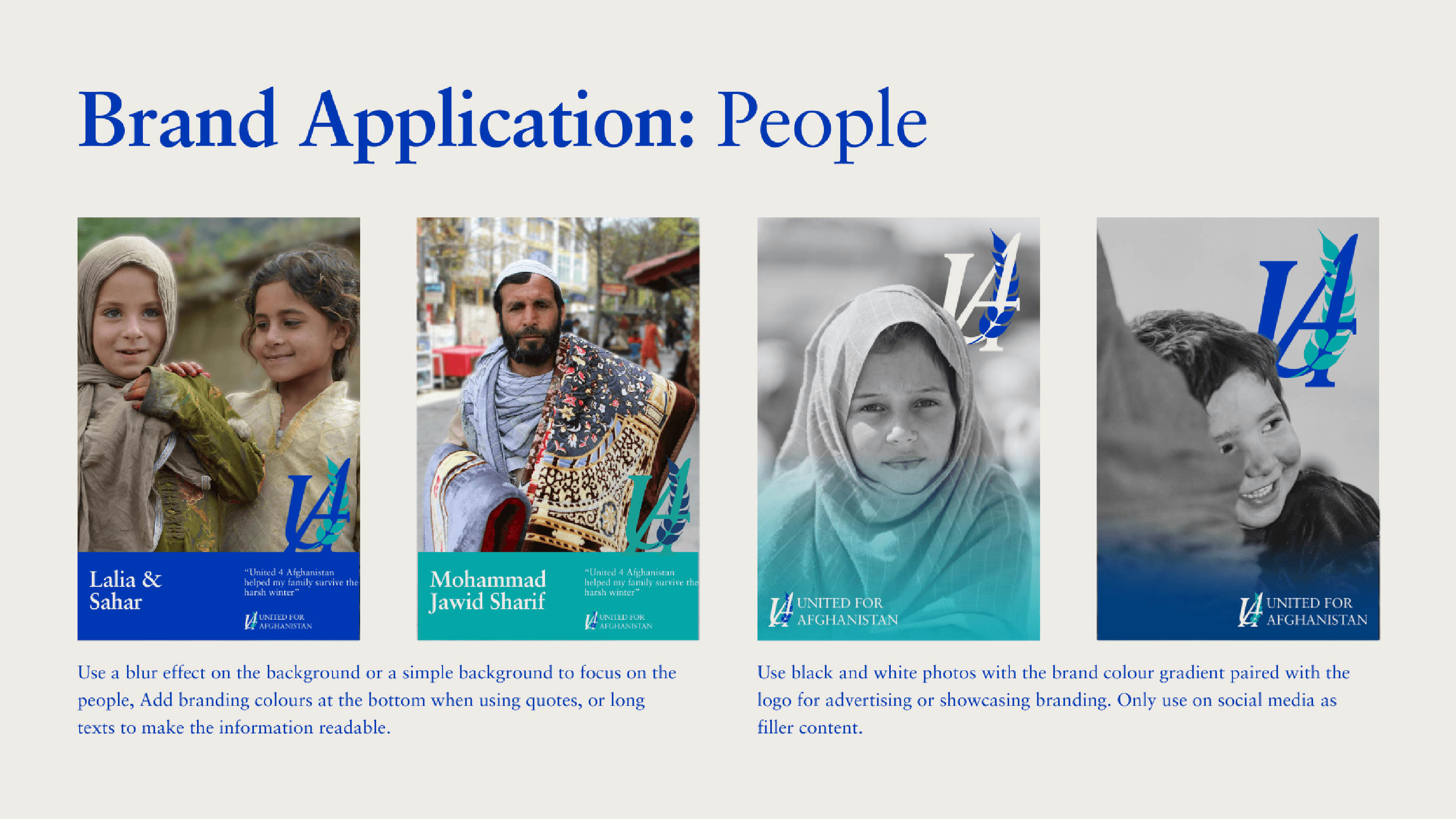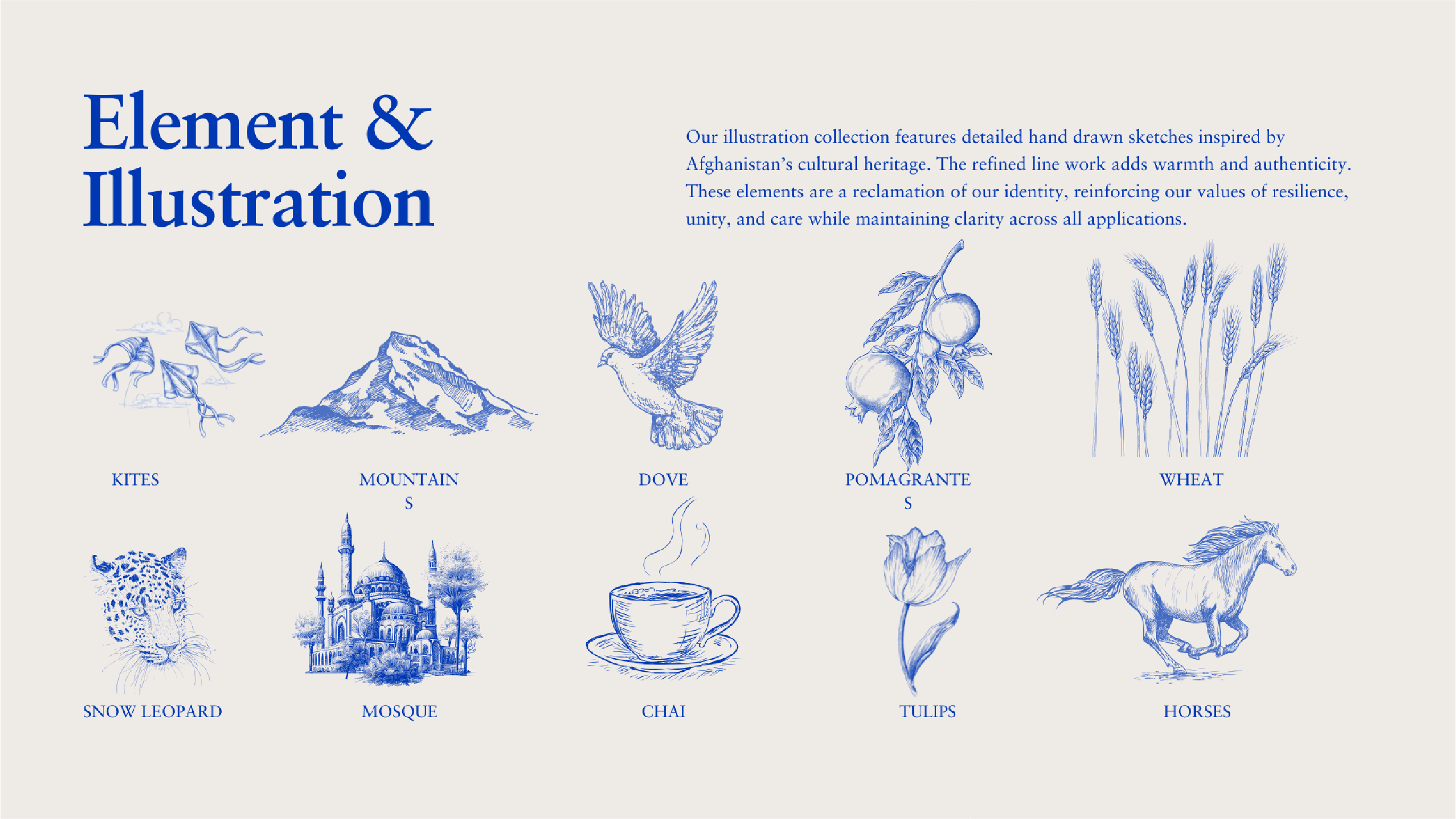 Our brand identity is built on a foundation of clarity, solidarity, and unity. Every element from our logo to our colour palette, reflects our commitment to empowering communities and bringing hope to Afghanistan. Our logo is a visual representation of our brand identity and should be used in accordance with established guidelines. This includes the proper use of colour, scale, and white space around it.